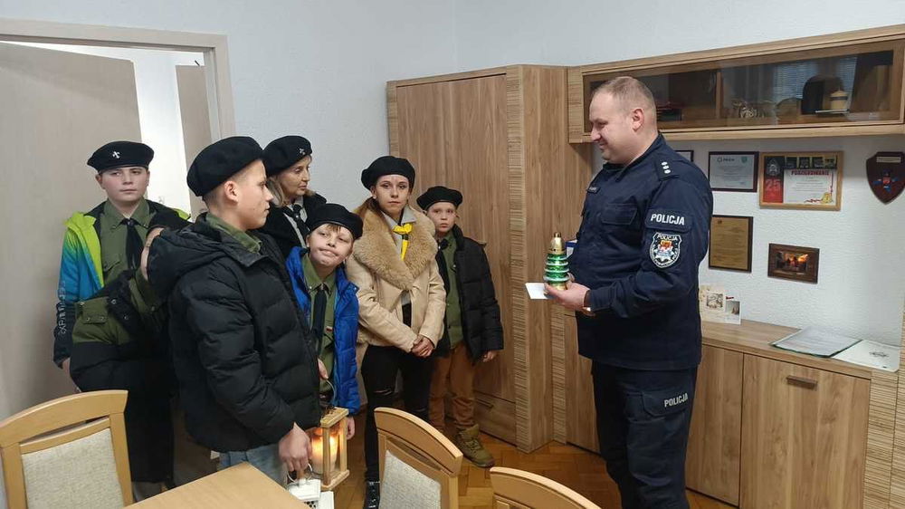 Przedstawiciele Związku Harcerstwa Polskiego złożyli policjantom i pracownikom cywilnym najserdeczniejsze życzenia z okazji nadchodzących świąt. Komendant odwzajemnił życzenia i na pożegnanie poczęstował harcerzy słodyczami.