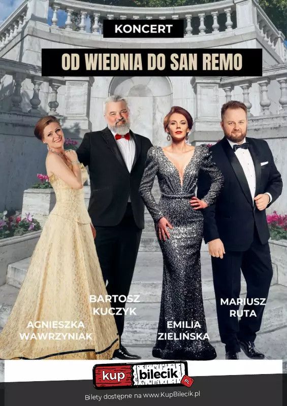 bilety: Koncert "Od Wiednia do San Remo" w wykonaniu kwartetu artystów: sopranistek Emilii Zielińskiej i Agnieszki Wawrzyniak, które na scenie czarują nie tylko pięknymi głosami, ale również klasą, elegancją i wspaniałymi strojami starannie dobranymi do charakteru utworów. Paniom na scenie towarzyszą tenorzy znani m.in. z projektu Vincero wspaniały interpretator utworów włoskich Mariusz Adam Ruta oraz złotousty Bartosz Kuczyk. W programie znajdują się piękne pieśni neapolitańskie, utwory prosto z wiedeńskiego nowego roku, aż po przeboje znane z pamiętnego włoskiego festiwalu w San Remo. Ok 100 minutowa uczta muzyczna pozostawi w jej uczestnikach pełen bukiet muzycznych wrażeń na długi czas. Bilety do nabycia na: KupBilecik.plOd Wiednia do San Remo artyści: Różni artyściKoncert "Od Wiednia do San Remo", to podróż muzyczna, w której zaprezentujemy państwu przeboje znanych kompozytorów, którzy tworzyli na terenie Austrii, takich jak J. Strauss, F. Lehar, E. K almann czy R. Stolz. Będą to arie i duety ze znanych operetek m.in. "Wielka sława to żart", "Twoim jest serce me", "Duet księżycowy", nieśmiertelne "Brunetki, blondynki" i inne, a następnie konferansjer przeniesie nas w świat muzyki rozrywkowej, gdzie soliści zaprezentują znane przeboje włoskie, które odniosły sukces na festiwalach w San Remo, stając się przebojami światowymi i tu usłyszą państwo "Miłość w Portofino”, "Di mi quando tu vera", "Il mondo", "Ci sara", "Nie płacz kiedy odjadę" i wiele innych. Bilety do nabycia na: KupBilecik.pl |